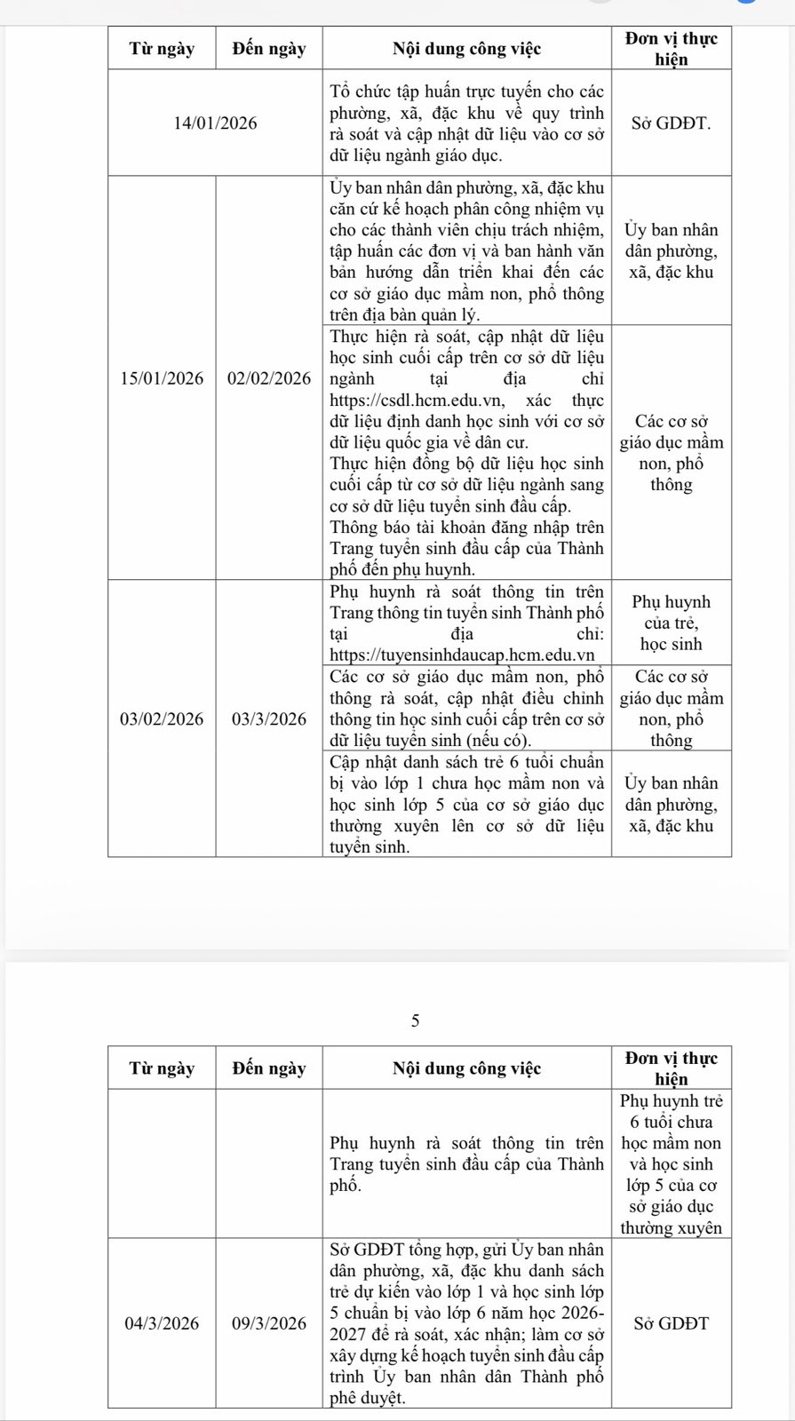 Ủy ban nhân dân phường, xã, đặc khu chịu trách nhiệm cập nhật danh sách trẻ 6 tuổi chưa học mầm non và học sinh lớp 5 ở các cơ sở giáo dục thường xuyên lên hệ thống cơ sở dữ liệu tuyển sinh đầu cấp, thông báo phụ huynh kiểm tra, xác nhận thông tin trên Trang tuyển sinh đầu cấp của thành phố tại địa chỉ https://tuyensinhdaucap.hcm.edu.vn.